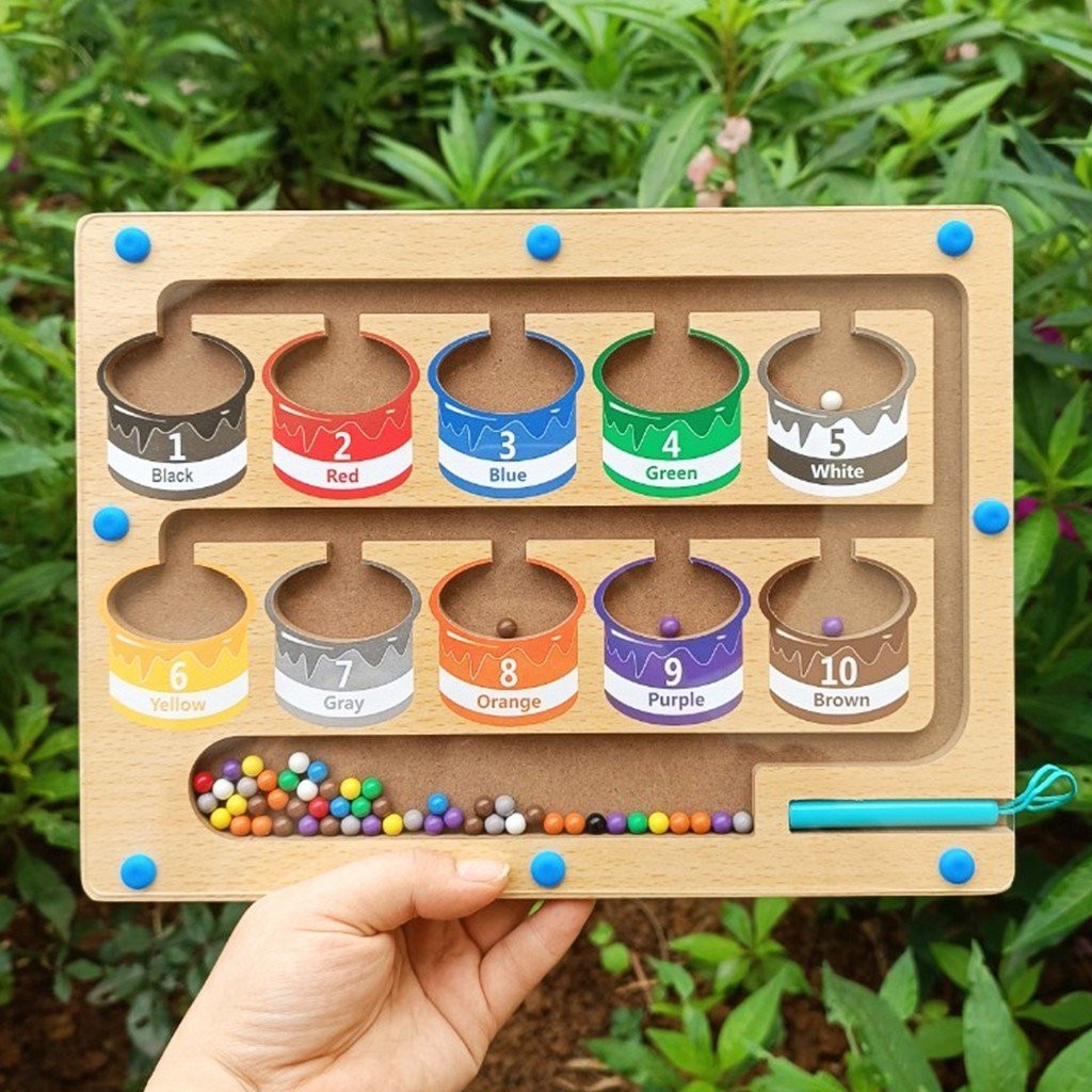 - Đặc điểm + Mê cung màu và số từ tính này đi kèm với một cây bút từ tính có thể di chuyển các hạt rơi chúng vào mỗi lọ phù hợp với màu sắc. Đồng thời, có sẵn để đếm các hạt. Không chỉ có thể cải thiện khả năng nhận dạng màu sắc của trẻ mà còn học về đếm và toán học.