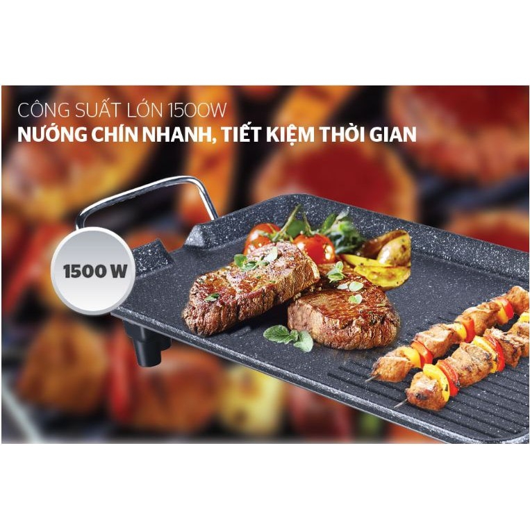 Phía dưới được thiết kế 4 chân trụ bám chắc chắn bạn có thể hoàn toàn yên tâm trong quá trình sử dụng. Dây điện có thể tháo rời giúp việc bảo quản bếp gọn gàng hơn. Nướng chín nhanh, không tạo khói Nướng nhanh, chín đều, tiết kiệm điện năng Bếp nướng điện SUNHOUSE SHD4607 hoạt động với công suất lớn 1500W làm nóng mặt bếp nhanh, nướng chín thực phẩm mau, tiết kiệm điện năng. Kết hợp mặt bếp bằng đá hấp thụ nhiệt nhanh, giữ nhiệt lâu giúp nướng nhanh hơn mà thực phẩm vẫn chín đều, giữ được đầy đủ chất dinh dưỡng. Đa chức năng, dễ dàng điều chỉnh Bếp có 5 mức độ nhiệt khác nhau, dễ dàng điều chỉnh qua núm xoay cho phù hợp với ý thích. Mặt bếp lớn, gồm 2 phần: một mặt phẳng và một mặt rãnh, có thể làm chín nhiều thực phẩm cùng lúc. An toàn cho sức khỏe Mặt bếp được phủ 2 lớp chống dính đá hoa cương Whitford (USA) siêu bền kháng khuẩn.