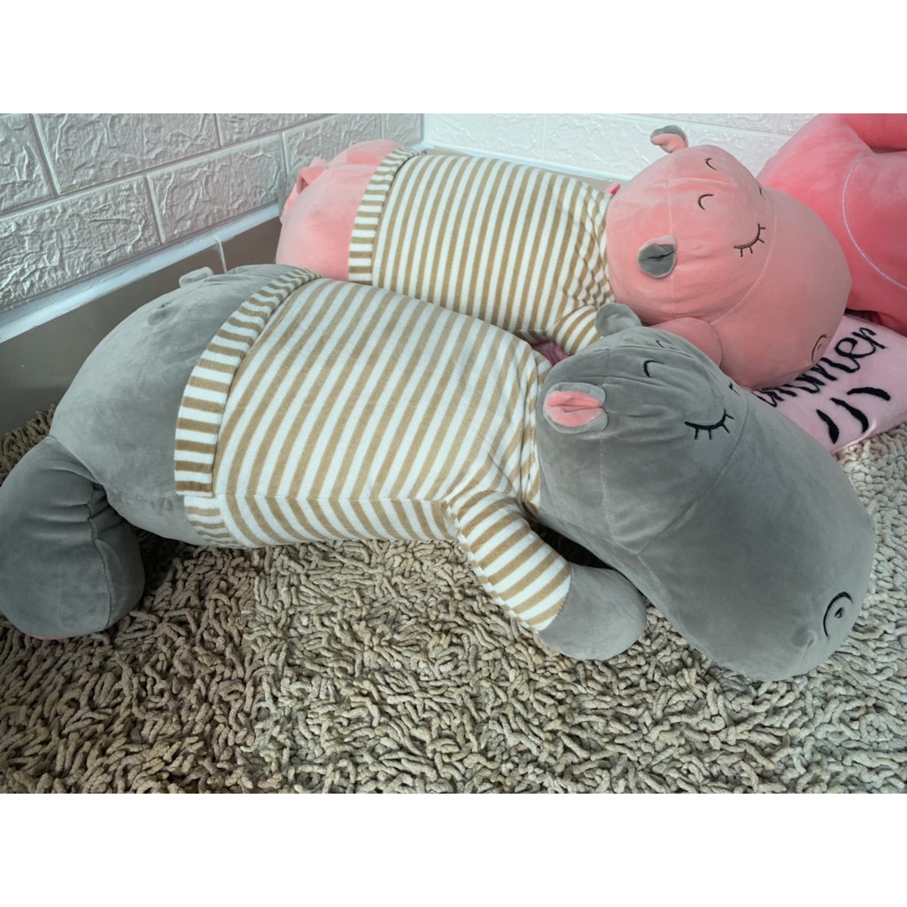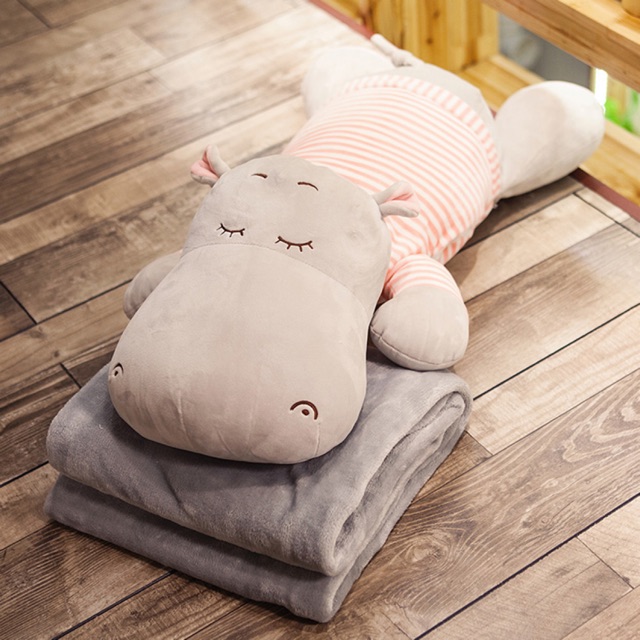Gối được thiết kế xinh xắn với hình hà mã xinh xắn, có thể gối đầu hoặc dựa lưng êm ái. Chăn được thiết kế khéo léo có thể xếp gọn, khi dùng có thể lấy chăn ra dễ dàng với thao tác đơn giản.