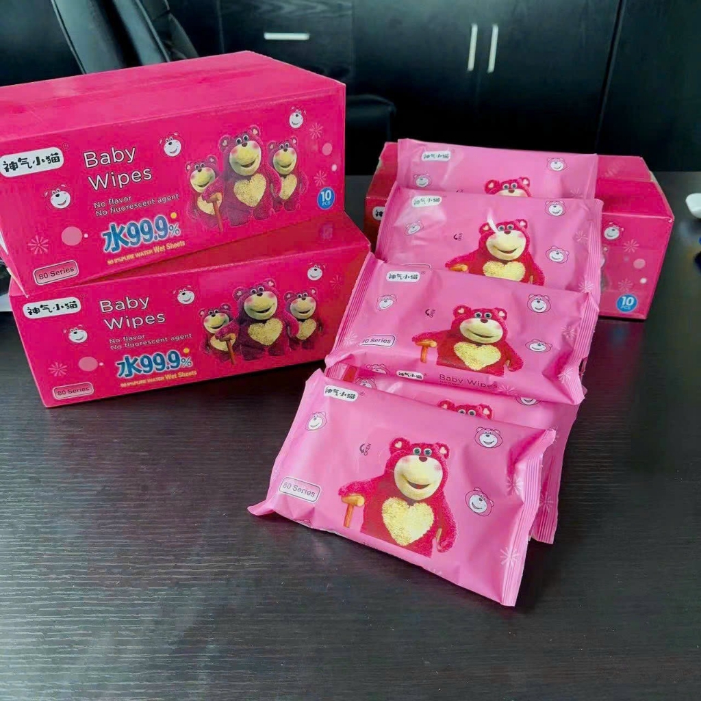 Thùng 10 Gói Khăn Ướt Gấu Dâu Hồng Mẫu Mới (Dây 9 Thùng)
