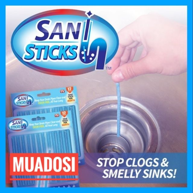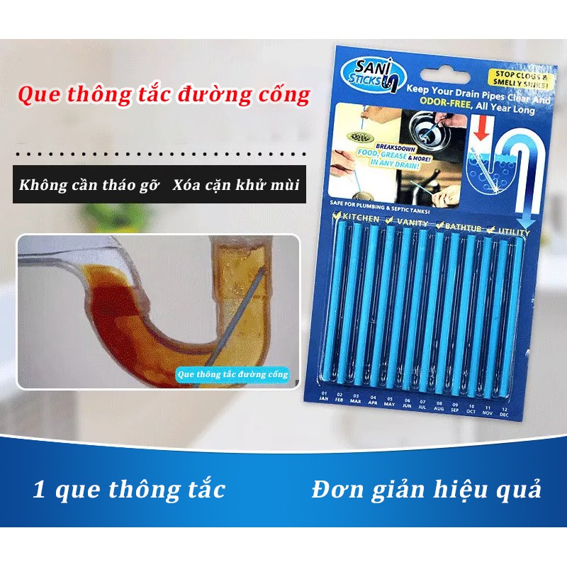– Que thông tắc bồn cầu, bồn rửa bát Sani Sticks giúp diệt sạch mọi vi khuẩn có hại, cho đường ống nước luôn thông thoáng.